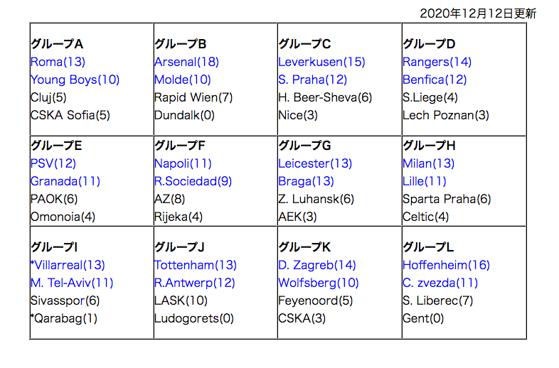 グループリーグ順位表 Uefaヨーロッパリーグ 21 El 組み合わせ 試合結果 日程 フットボールチャンネル