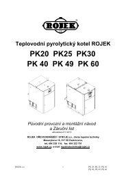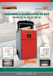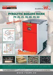Be the first to review this product. A 15 DH 10 E DH 10 EP DH 10 S DH 10 SP DH 10 TP KTP KTP PELLET KTP 25 KTP 25 PELLET KTP 30 KTP 30 PELLET KTP 40 KTP 49 KTP 80. ROJEK Teplovodní kotel PK 30 pyrolitický, na suché dřevo PK 30 Teplovodní pyrolytický kotel na tuhá paliva (s dochlazovací smyčkou) jmenovitý výkon kotle 30 kW Pyrolytický kotel PK 30 na ruční přikládání je určen ke spalování palivového dřeva - kusové dřevo o délce 530 mm, vlhkost paliva do %, výhřevnost 14 - 18 MJ.kg.