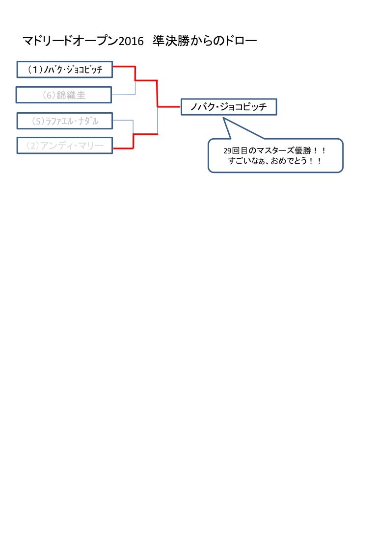 前回のマイアミオープン決勝での雪辱を晴らしたいところです! 目次へ戻る 関連記事 錦織圭マドリードオープン16の結果! 錦織圭とジョコビッチの対戦成績を一覧で確認 錦織圭のマドリードオープン16、放送するチャンネルを紹介!. テニス 16 全仏オープン 3回戦 錦織×ベルダスコ戦のプレビューと結果. マイアミOP、バルセロナOPで準優勝という結果を残した錦織圭。 今季はここまで、安定して好成績を残しています。 昨季・ベスト4だったマドリードOPでの活躍にも、期待がかかります! マドリード・オープン16 ドロー・組み合わせ表 IMG_1248 / Marianne Bevis ベスト8 ※全組み合わせ表は一番下に….