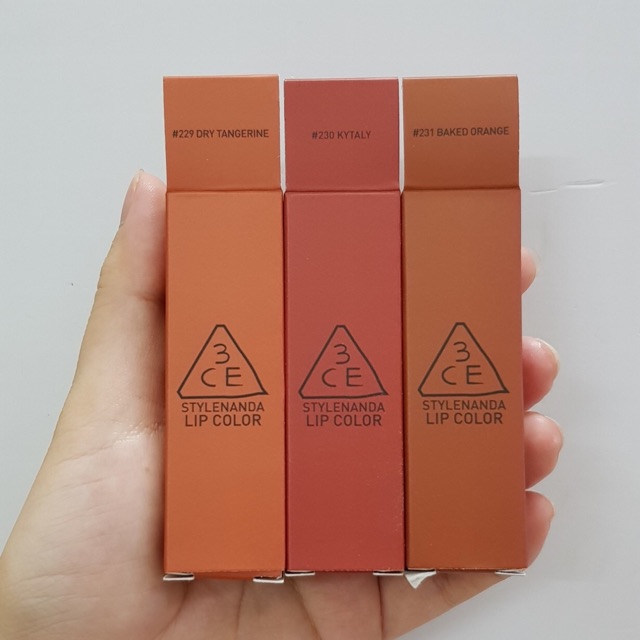 3CE các màu mới nhất 229-230-231. 3ce matte lip color (230 kytaly) 18.45 usd:. – Màu #229 – Dry Tangerine – màu vỏ quýt khô – pha đất ít nên em này tươi trẻ và năng động nhất đây – Màu #230 – Kytaly – tông đỏ gạch pha hồng xíu xiu, lên môi son nghiêng về tông ấm xinh cực kì luôn ạ – Màu #231 – Baked Orange – cam cháy pha nâu, tông son xịn mịn, sang chảnh *Son Mood Recipe 17 vẫn giữ.